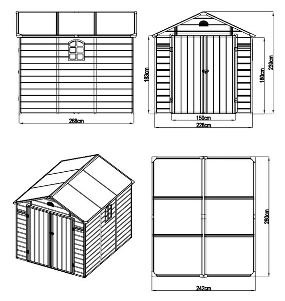 Vrtna hišica je izdelana iz visokokakovostnega plastičnega materiala – lahka in trpežna. Plastični stebrički z debelino materiala 1,5 mm, zunanje plastične plošče z debelino 12 mm in kovinske ojačitve zagotavljajo zadostno trdnost.